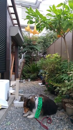 今回は、エンゼルトランペットだ。ラッパ状の花がぶら下がるように開花する熱帯花木。和名は「木立朝鮮朝顔(キダチチョウセンアサガオ)」。毒があるので扱いに注意が必要と言う。 <2019年11月3日> 美咲が丘 ◇ 高さが3m以上あるので、縦に撮影。 ◇ 確か…